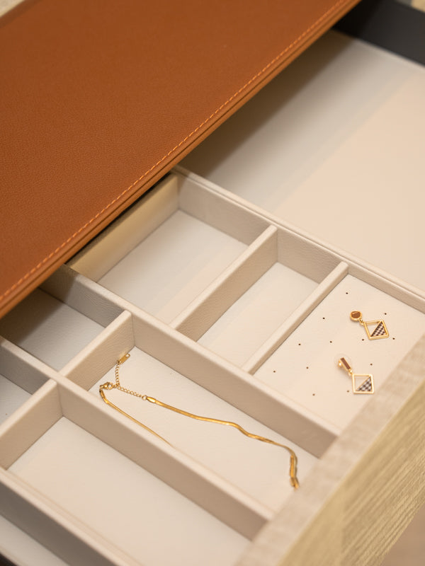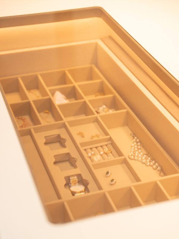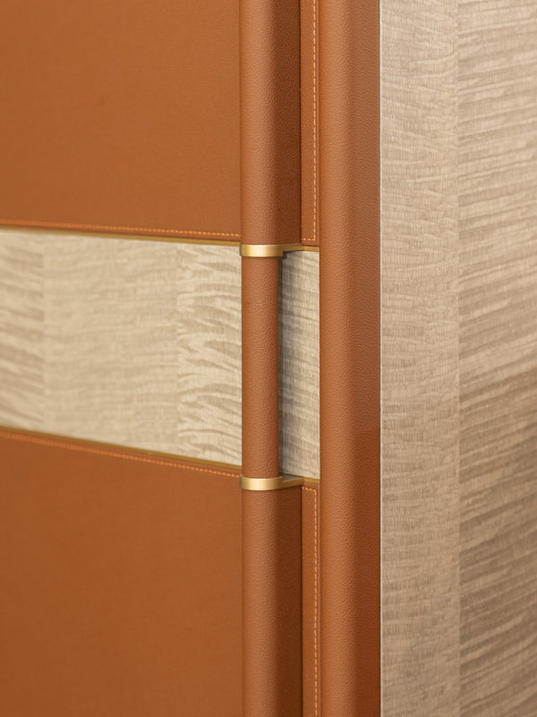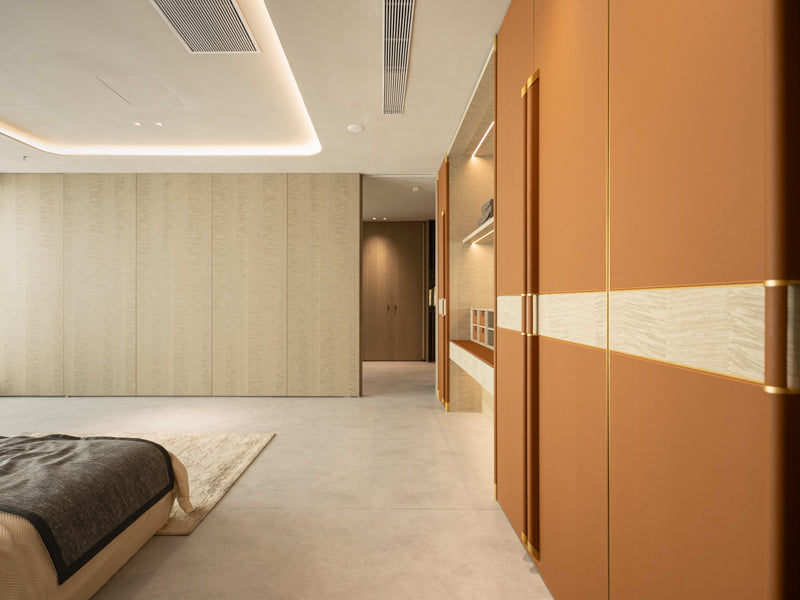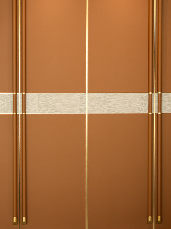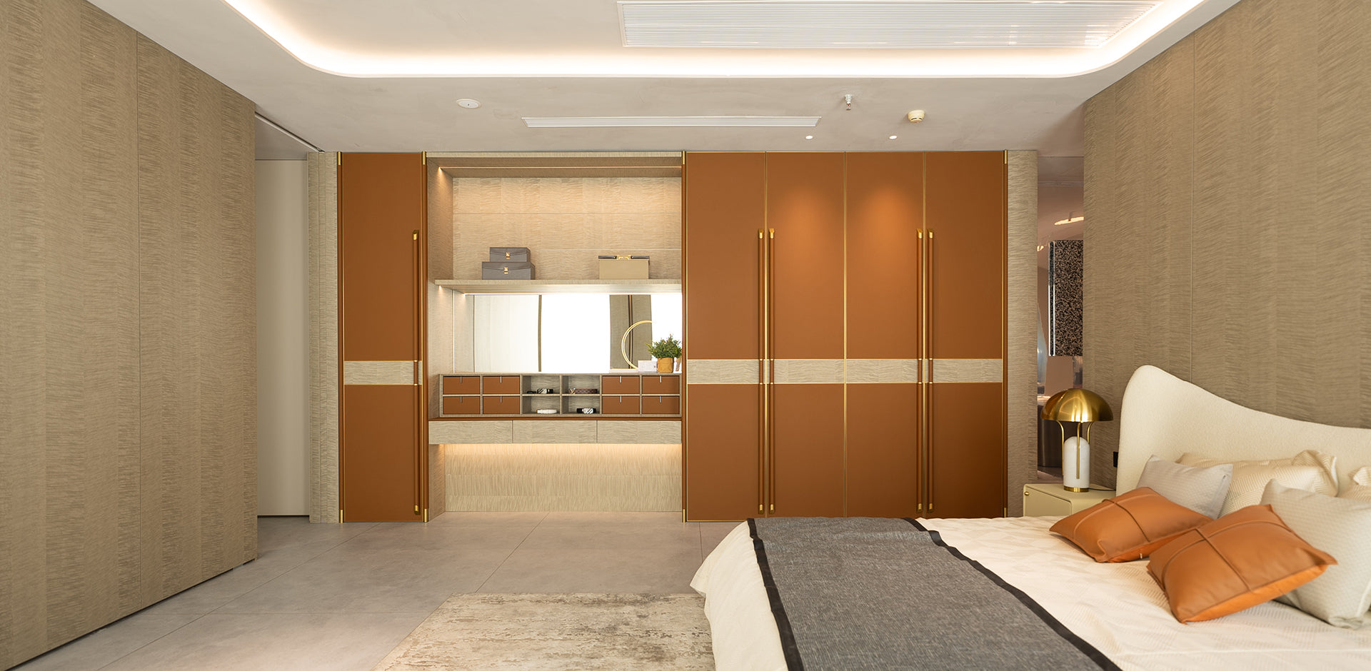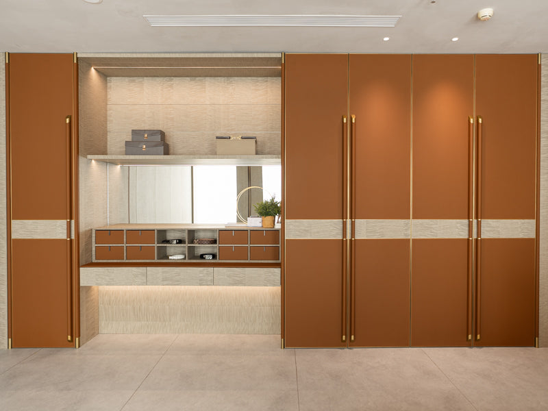 A contemporary luxurious design combining soft earthy tones with metallic accents. Ideal for modern homes looking for a unique wardrobe solution that doubles as a personal grooming area.