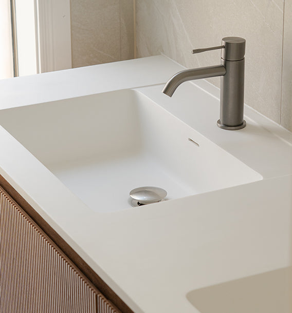 Gunmetal tapware adds subtle contrast, and warm-toned tiling across floors and walls brings a sense of comfort and cohesion. Natural materials and soft forms come together to create a calm, understated elegance that suits everyday use and quiet retreat alike.