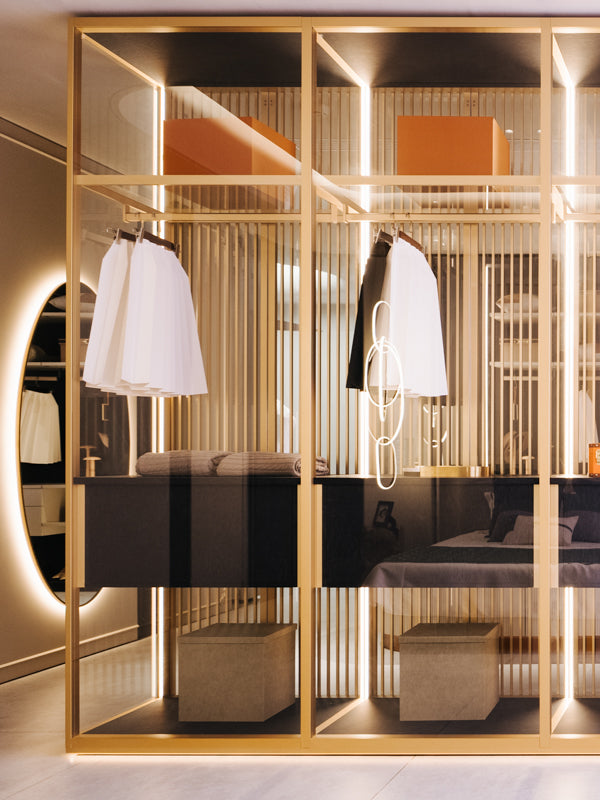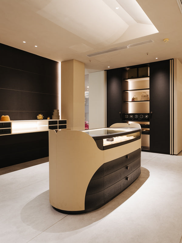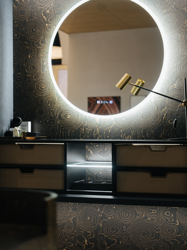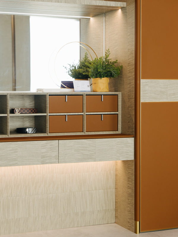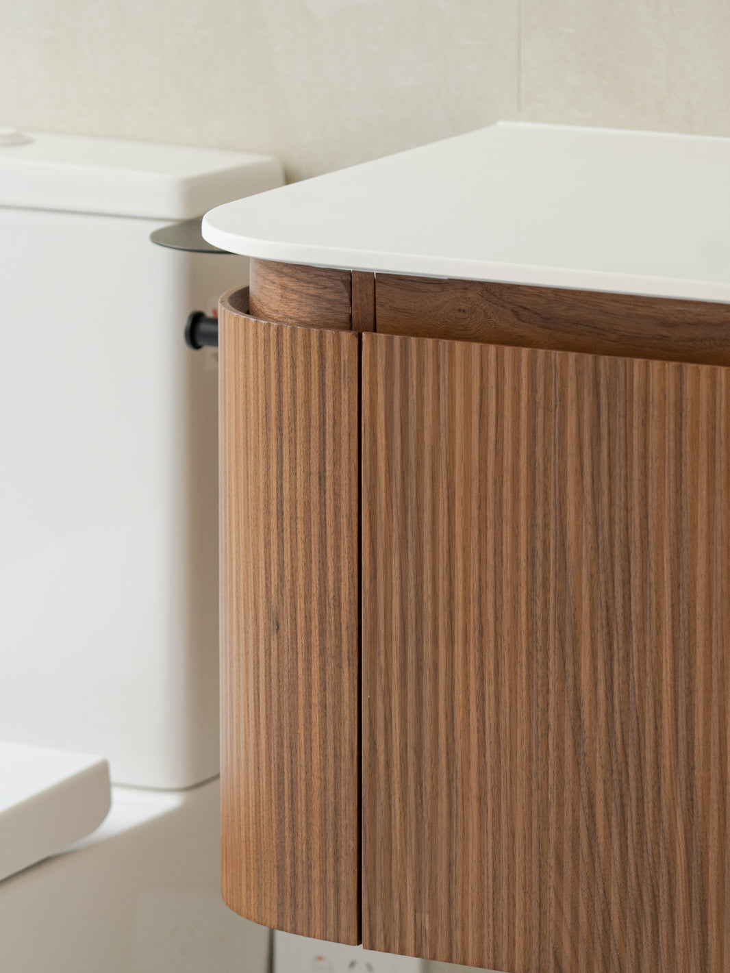Across both wet areas, the bathroom design reflects a warm, tactile sensibility anchored by custom joinery and a cohesive material palette. Walnut timber veneer cabinetry with curved, textured door fronts introduces a sculptural softness, complemented by matching wall-mounted units that enhance vertical storage without compromising visual clarity. The vanities are paired with white integrated benchtop basins, offering a seamless, refined finish.