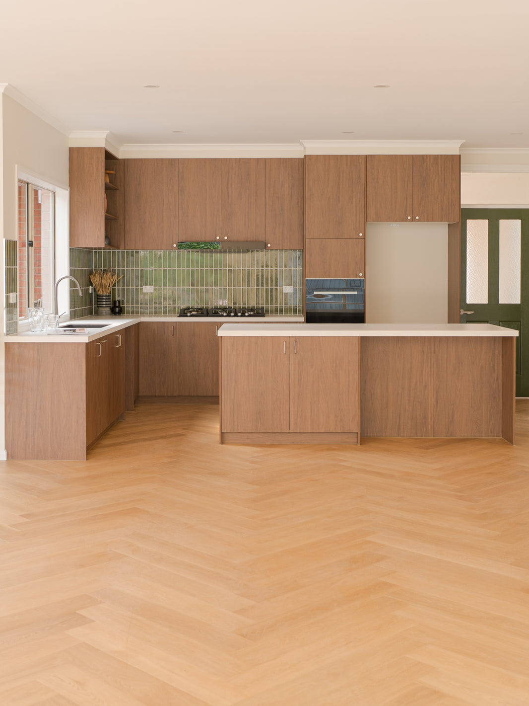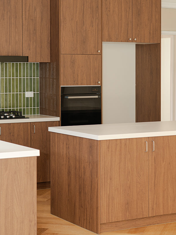The kitchen has been thoughtfully reimagined with a practical L-shaped layout and a central island bench, offering ample workspace and integrated storage. Dark walnut cabinetry brings vertical emphasis and elegance, paired with stainless steel hardware for a subtle contemporary edge. The island features drawers, cupboards and a casual bar zone, making it both functional and inviting. Aged green mosaic tiles add depth and character, balanced by a crisp white stone benchtop that nods to retro-modern styling.