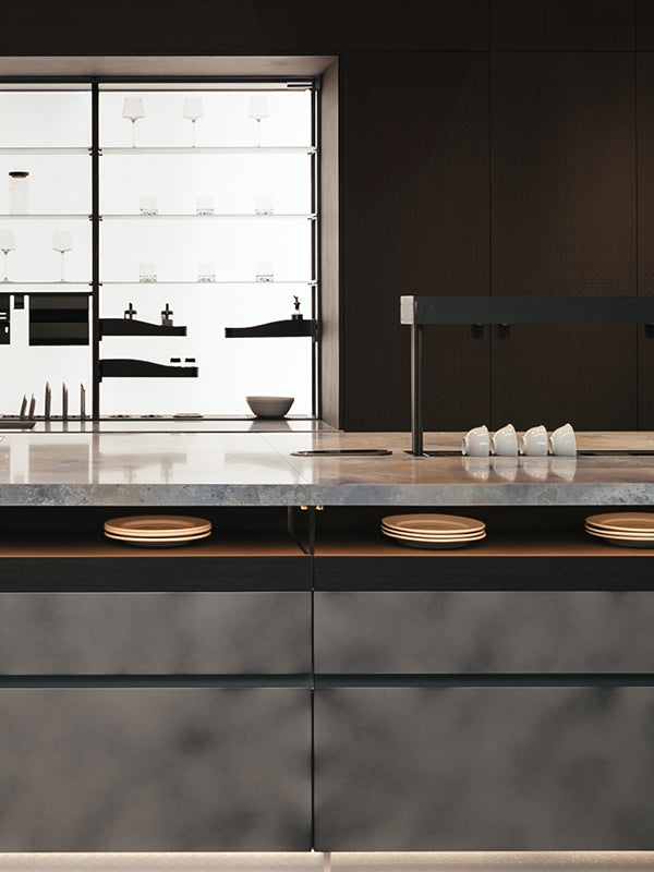 The Radiant Cascade Kitchen blends sleek modernity with a touch of artistic flair, creating an extraordinary centerpiece for any home. The design features custom metal-finish cabinetry, a blue stone countertop, and underlit storage for a soft, ambient glow. The standout element is the overhead cascade-style light installation, which adds a dynamic, sculptural touch to the space. Perfect for both entertaining and culinary creativity, this kitchen redefines functional art.