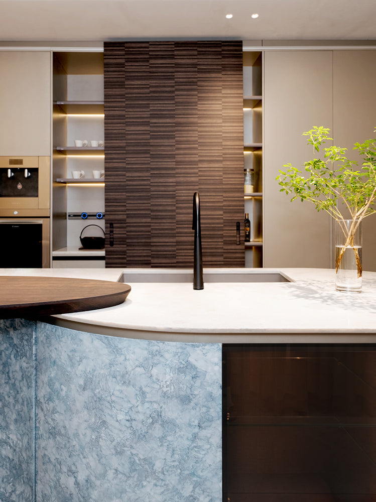The Halo Luxe Kitchens embodies a perfect blend of modern minimalism and elegant curves, designed to create a calming and luxurious atmosphere. With its soft-toned curved cabinetry, brushed metallic accents, and integrated ambient lighting, this kitchen offers both style and practicality. Featuring seamless built-in appliances, rich wooden textures, and a luminous marble-effect backsplash, it sets a sophisticated tone for contemporary living.