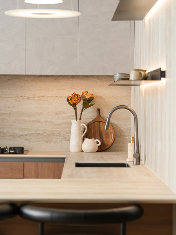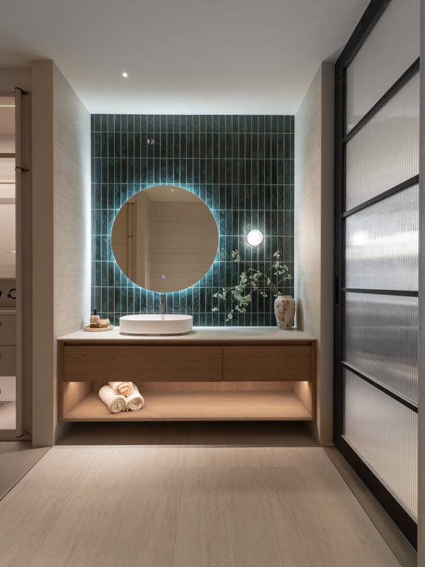 A serene retreat that blends natural textures with refined finishes. The space is anchored by a striking marble vanity, complemented by warm brass fixtures and a curated mix of stone and tile. Soft lighting enhances the room’s calming ambience, while thoughtful detailing creates a luxurious yet tranquil atmosphere.