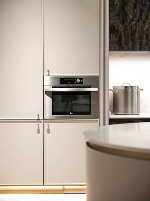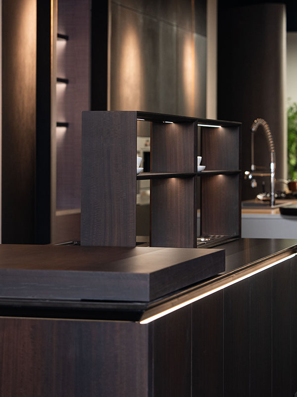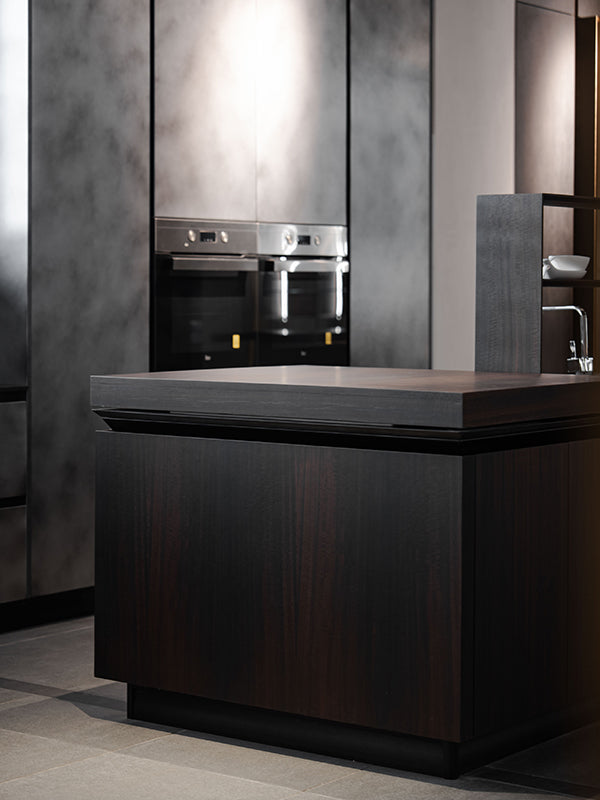 The Obsidian Frame Kitchen is a bold statement of modern industrial design, combining dark wood paneling with open modular shelving and metallic accents. Designed for both elegance and functionality, it features integrated task lighting, matte finishes, and smart storage solutions to optimize space. This kitchen strikes the perfect balance between contemporary luxury and practical innovation.